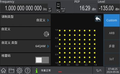 USG3000V系列射频矢量信号发生器,整机采用2U标准高度;射频输出频率可支持至6.5GHz频率范围,输出幅度可支持至+25dBm,支持有限调制速率的模拟调制(AM, FM, ΦM)和脉冲宽度调制。其中,脉冲调制器支持单脉冲调制,双脉冲调制及脉冲串调制模式,脉冲调制宽度最小支持至40ns,并且提供高达70dB的关断比。矢量信号调制可支持至6GHz频率范围;支持内部基带信号发生器与外部模拟基带输入,最大调制带宽支持150MHz。矢量信号调制的内部基带信号发生器可支持实时调制模式,本地ARB模式及远程ARB模式。内部基带信号发生器配合矢量信号源专用的信号生成软件(SignalStudio)可实现更多更复杂的调制信号,如WLAN,WCDMA,LTE,5G/NR等。内置110dB动态高精度的程控衰减器,最小输出信号支持至-135dBm幅度范围,更适用于微波元器件,可以为滤波器、放大器、接收机等器件及模组测试提供必要的信号。