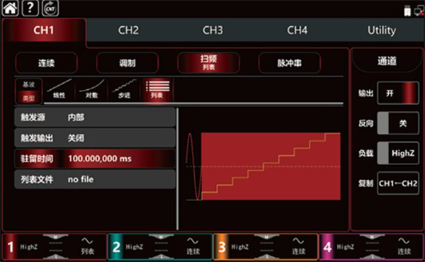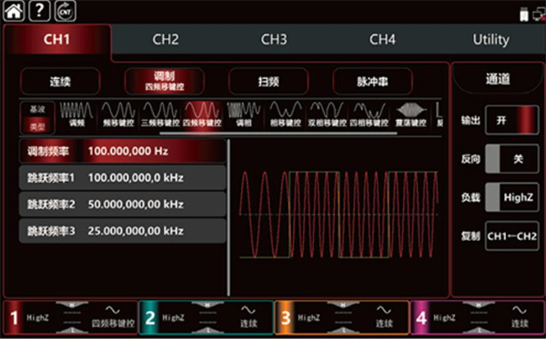 UTG9000T系列函数/任意波形发生器,使用DDS直接数字频率合成技术,可生成高精度、稳定、纯净、低失真的信号,还能提供高频率且具有快速上升沿和下降沿的方波。是一款高性能、多功能的四通道函数/任意波形发生器。便捷的触控操作界面、优越的技术指标及人性化的图形显示风格,可帮助您更快的完成工作任务,提高工作效率,是满足您目前及未来测试需求的多用途设备。