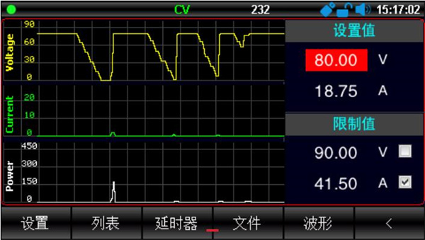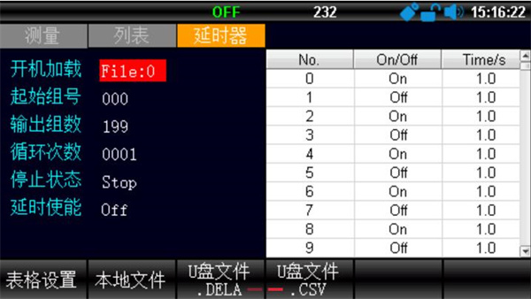 列表&延时器,支持200组的输出设置,时间分辨率最低100ms 列表模式:可单独设置每一组的电压电流值和输出时间值 延时器模式:可以设置各组的输出开/关状态。