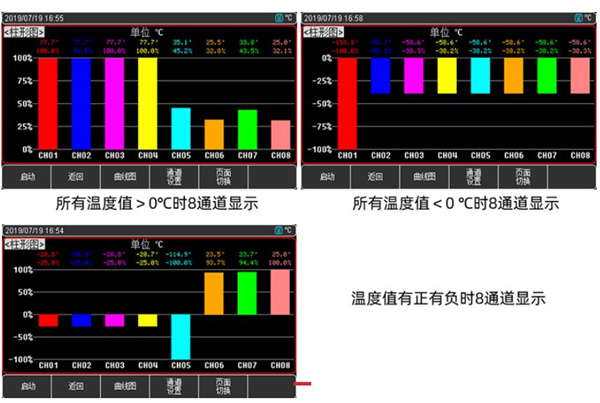 自动模式:同一组测试模块上8个通道温度数值高低百分比比较,用于比较8个通道测试数值的高低,仪器一般默认自动模式。 手动模式:对当前测试通道的温度在所设定的温度范围区间的比重,可以直观观察到所测温度距离超限值的距离。