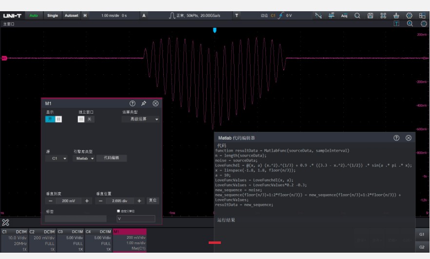 利用Matlab强大的数学库,您可以自定义编写数学算法,您可以直接运行Matlab代码,并将结果直接显示在示波器界面中。