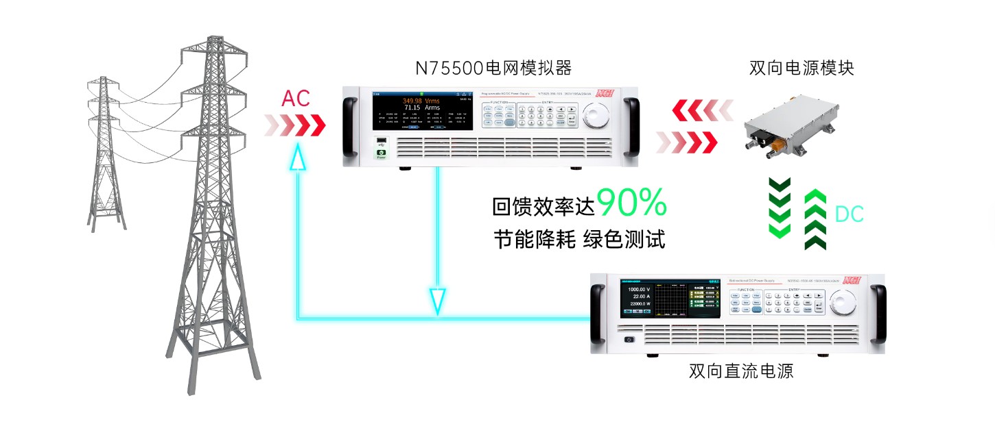 N75500系列内置强大的任意波形编辑功能,可精准模拟各类电网扰动与复杂波形。其能量回馈设计能将测试过程中产生的电 能回馈至电网,显著降低运行能耗与测试成本。