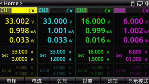 UDP4303S可编程线性直流电源设计4个独立通道。CH1/CH2能够提供32V/3A输出,支持一键等性能串并联;CH3独立通道提供15V/3A输出,CH4独立通道提供6V/10A输出。该直流电源具备4通道电压、电流、功率波形实时显示功能