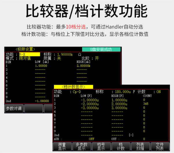 比较器功能:多10档分选,可通过Handler自动分选