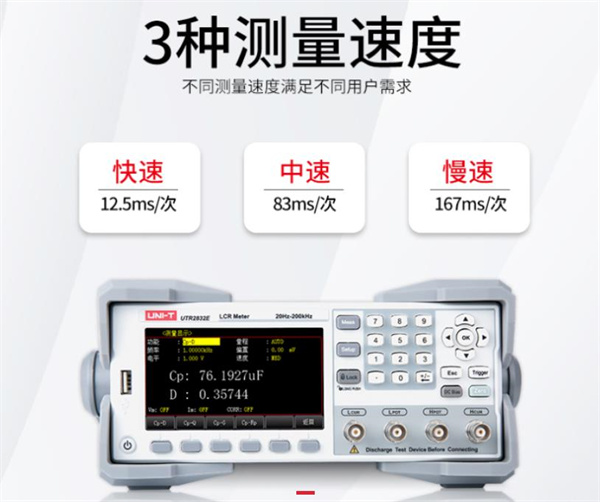 UTR2830E系列LCR数字电桥采用4.3英寸TFT-LCD显示屏,最高可支持四参数同时显示,测试频率20Hz~300kHz,全数字键盘,搭配实时操作系统,操作更简便,0.05%的基本精度,比较器支持10档分选,测试更可靠。可满足生产