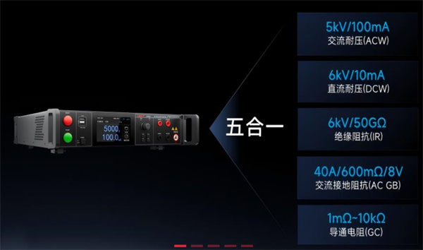 UT5400系列集交流耐压测试、直流耐压测试、绝缘阻抗测试、交流接地阻抗测试及导通电阻测试五大功能于一体,交流耐压测试高达5kV/100mA,绝缘阻抗测试高达6kV/50GΩ,电压电流精度高达1%,分辨率高达1V/0.1nA,测量