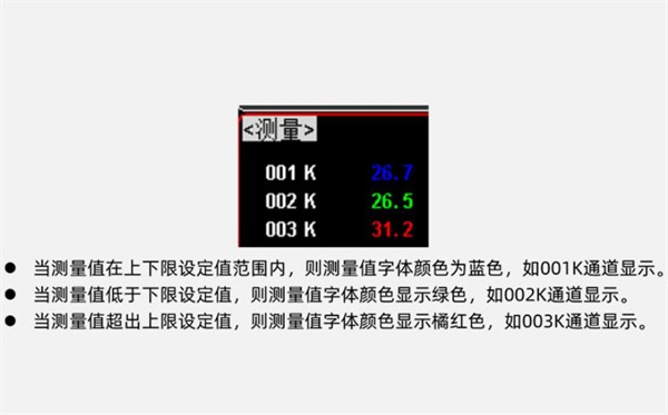特设温度上下限超限报警,和超限读数颜色变化警示,可对每一路温度数据进行上限和下限设置。