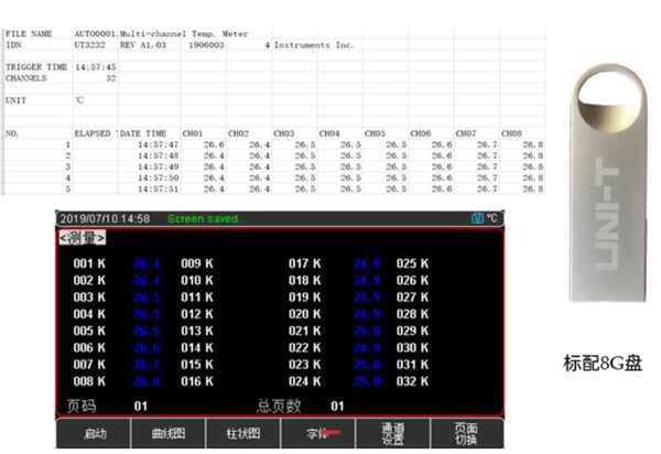 UT3200+系列多路温度测试仪,共有6款型号UT3208+/UT3216+/UT3224+/UT3232+/UT3240+/UT3248+,分别对应8、16、24、32、40、48通道,仪器4.3英寸液晶彩屏显示,界面美观,可同时对多路温度数据进行采集,上超下超报警和通讯传输,兼容多种温度传感器,响应速度快,数据稳定,同时具备断偶检测功能。