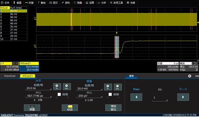 WaveScan被称为示波器中的Google, 能够实时地对采集到的波形进行测量分析,搜索出感兴趣的信号,可对搜索到的信号进行列表显示、高亮标识和放大观察,可以静态地“查找”,也可以动态地“扫描”。