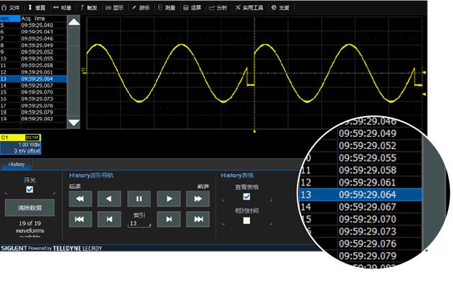 SDS3000X智能触发包括窗口、间隔、漏失、欠幅、斜率、边沿、脉宽、判定合格、逻辑图、高清视频和串行总线触发(I2C、I2S、SPI、UART/RS232、LIN、CAN、CAN-FD、FlexRay、MIL1553、USB 2.0)。并且还标配了顺序和历史模式。顺序模式下,两帧之间的最小死区时间为1 us, 其等效刷新率可达100万帧/秒。 配合后台运行的历史模式是故障分析的有力工具。