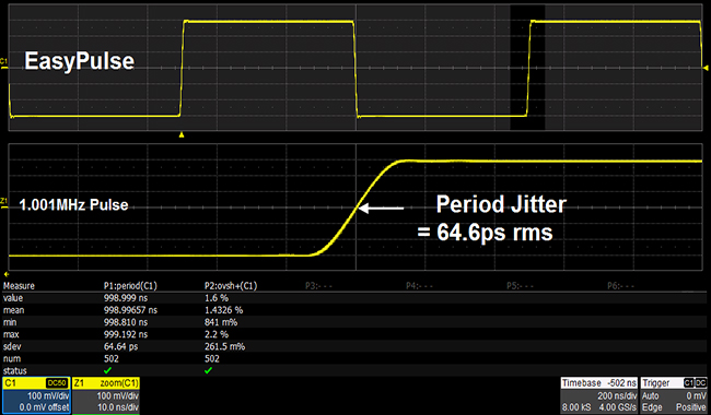 DDS方法输出方波/脉冲时, 如果采样率和输出频率不成整数倍关系,将产生一个采样周期的抖动。采用EasyPulse技术可克服这个缺陷;产生低抖动的方波和脉冲信号,此外还具有以下优势: