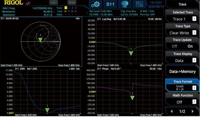 VNA模式可以实现对元器件、电路网络的S11、S21以及故障点定位的测量,通过史密斯圆图、极坐标等多种显示更精确地表征被测件的网络特性。