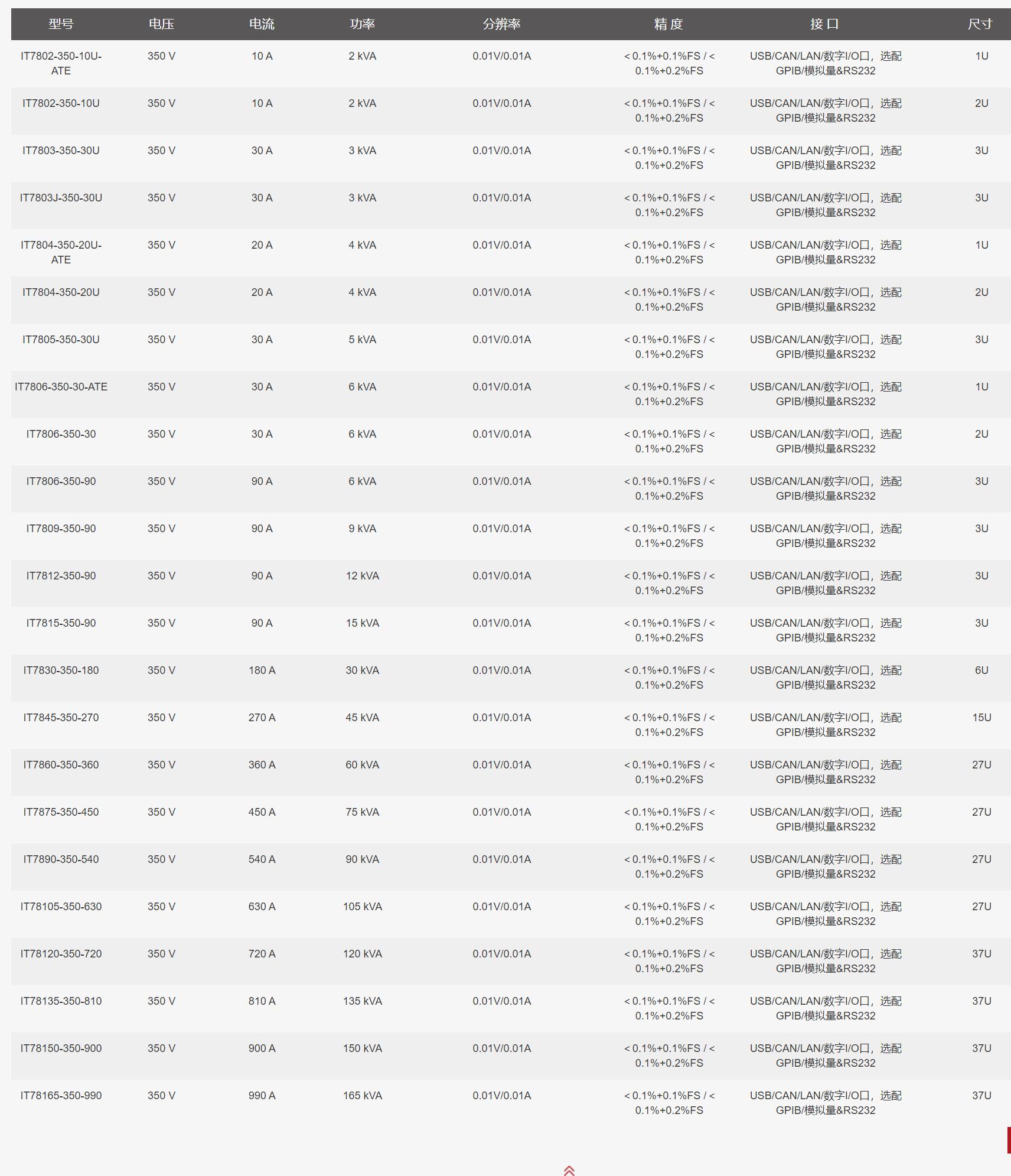IT7800系列在3U的有限空间里面,不但提供了高达15kVA的功率输出,同时电压输出可达350V,体积仅为传统交流电源的1/12,大大节约了测试空间,为用户提供了可以直接放置在实验桌上的大功率测试方案。